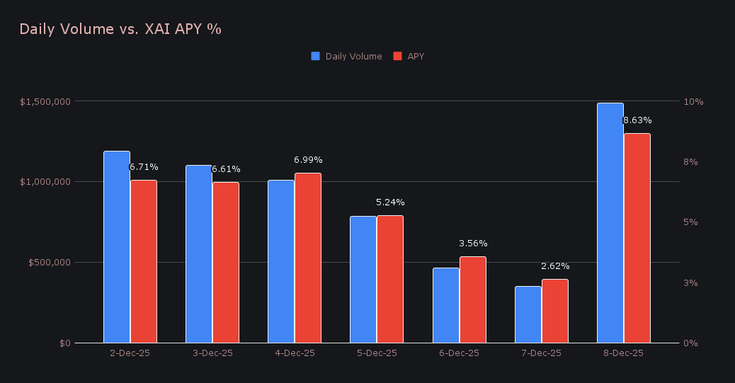 Staking followed a similar tempo. Stakers earned 149,829.15 XAI worth $18,130, with the average APY landing at 5.77%. The clearest high point came on December 8th, when 31,727.95 XAI was distributed to the staking vault at an 8.63% APY, supported by $1.48m in daily shifting volume. The December 8th payout stood out only marginally, serving more as a mild outlier than a true spike in an otherwise quiet backdrop.