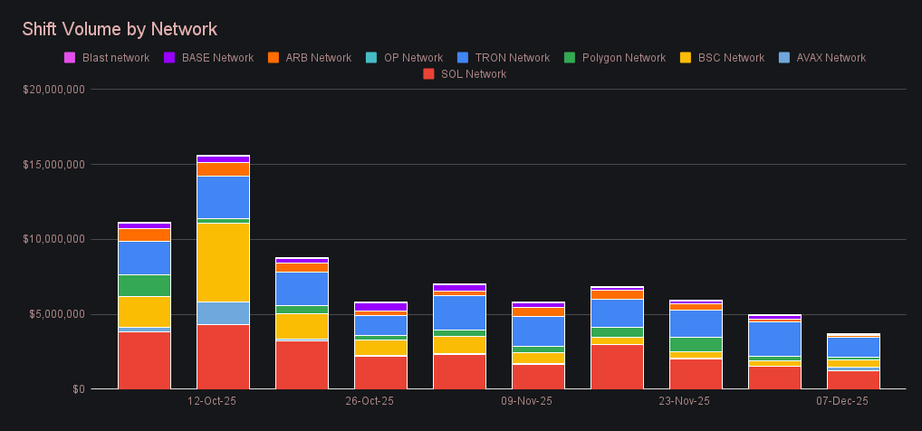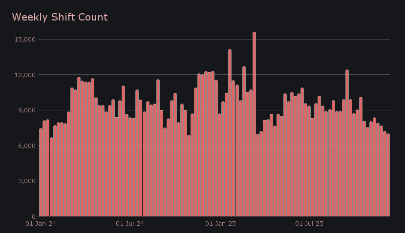 Shift count closed at 7,009 (−2.6%), marking the fourth straight week in the 7k range, a level that has quietly become the norm through November and early December. Although it moved lower this week, count has been far steadier than volume in that same timespan, which comparatively has fallen much more sharply as larger shifts significantly slowed. With fewer whale transactions and many users waiting out the market, activity centered on smaller, routine moves, leaving overall engagement present but carrying less weight. The result was a daily average of 1,001 shifts per day, accompanied by $909k in daily volume.