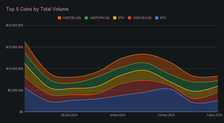 Stablecoin activity saw a reshuffle, with USDC (ERC-20) emerging as the clear outperformer at $1.90m (+102.5%). A large portion of this total came from a whale user whose series of sizable shifts also formed the week’s top pair, making that activity a key driver of USDC’s triple-digit rise. Deposits reached $392k (+34.2%), while settlements climbed to $780k (+80.1%), giving USDC a distinctly stronger profile than in recent weeks. The two USDT variants moved in the opposite direction. USDT (TRC-20) fell to $1.23m (−42.1%), giving back the momentum that nearly carried it to first place last week as deposits slid to $286k (−66.4%) and settlements eased to $533k (−9.0%). USDT (ERC-20) also declined, landing at $1.07m (−21.2%) with deposits steady at $420k (−3.0%) but settlements stepping down to $420k (−34.5%). Taken together, the three formed a clear pattern - USDC stepped into the space left by weakening USDT shifts, producing a stablecoin order that looked almost inverted from last week’s.