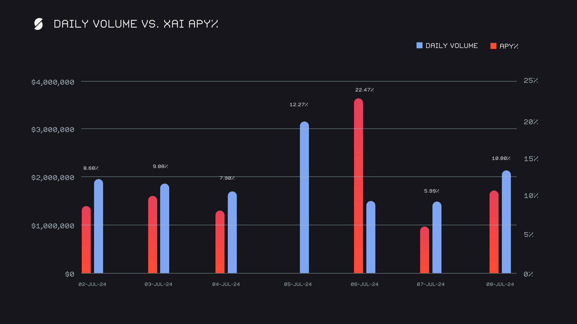XAI stakers received an average APY of 10.95% this week. The highest daily reward was distributed on July 6th, 2024 and totaled 67,582.58 XAI, translating to an APY of 22.47%. This single daily payout included rewards for the previous two days, which ended with respective volumes of $3.2m and $1.5m. Overall, this week saw XAI stakers receive a total of 205,703.51 XAI or $34,846.17 USD in staking rewards.