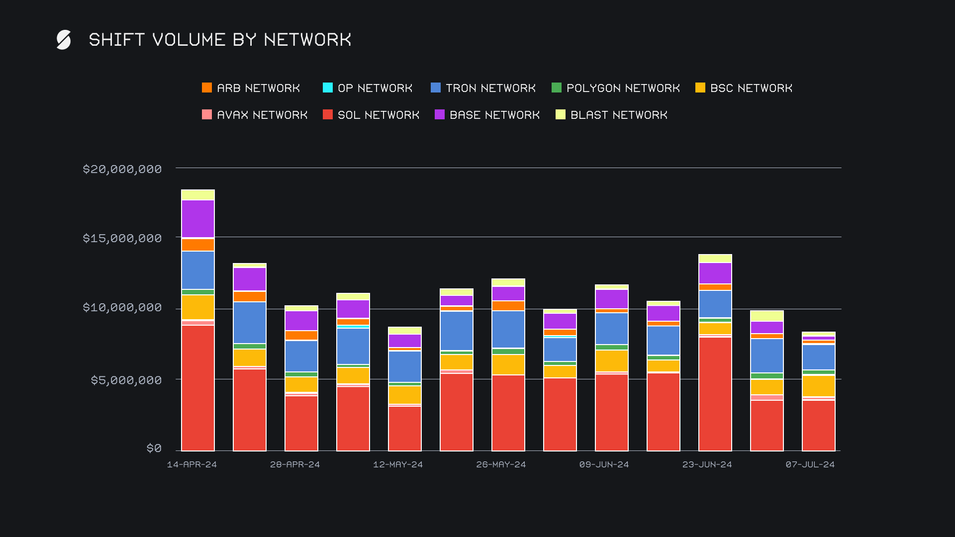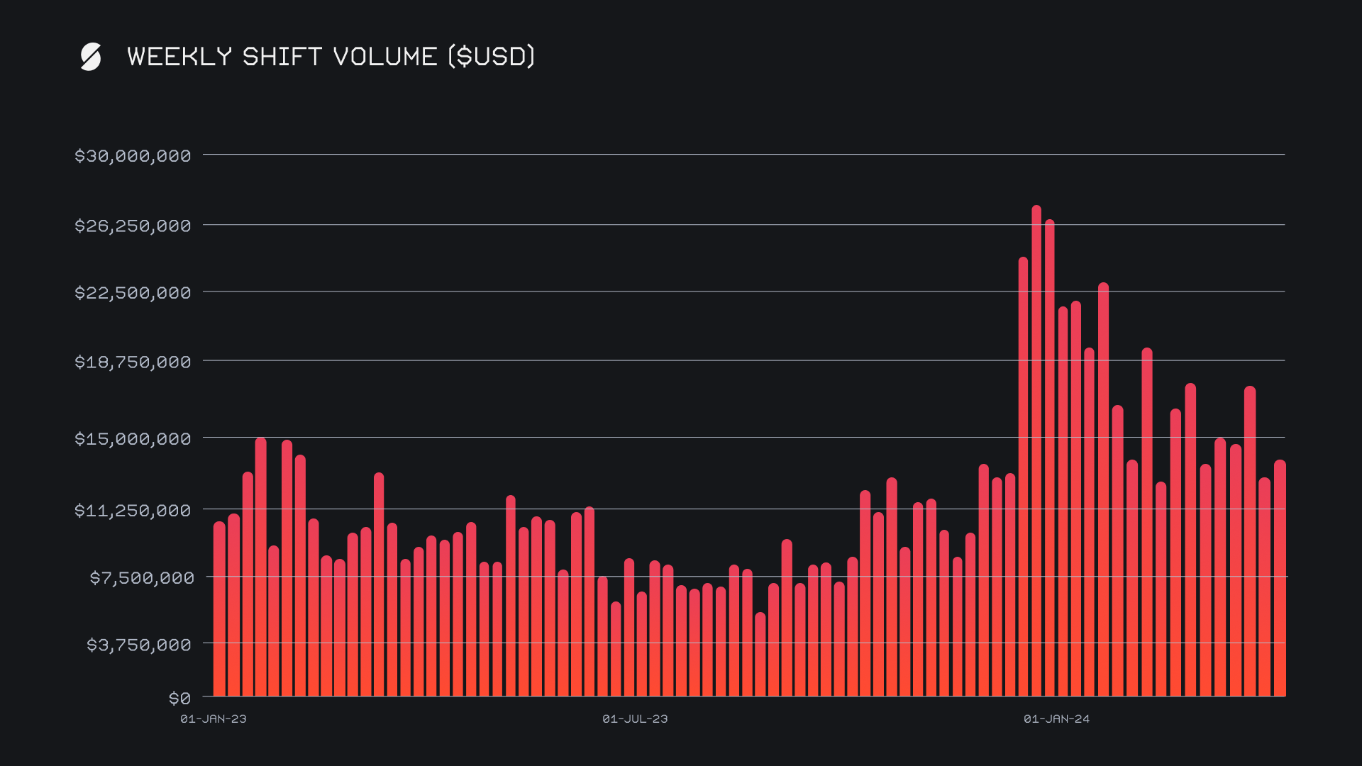 Despite the minor drop in shift count, our daily averages stood at $2.0m on 1,186 shifts, showcasing a steady demand which this week tended to center around both BTC and stablecoins. BTC/USDT (ERC-20) emerged as the week’s most popular pair among users with a weekly total of $805k, leapfrogging the previously dominant ETH/SOL pair. Similar to shift count, the positive difference of our weekly volume as compared to levels seen one year ago is evident, and noted in the below chart.