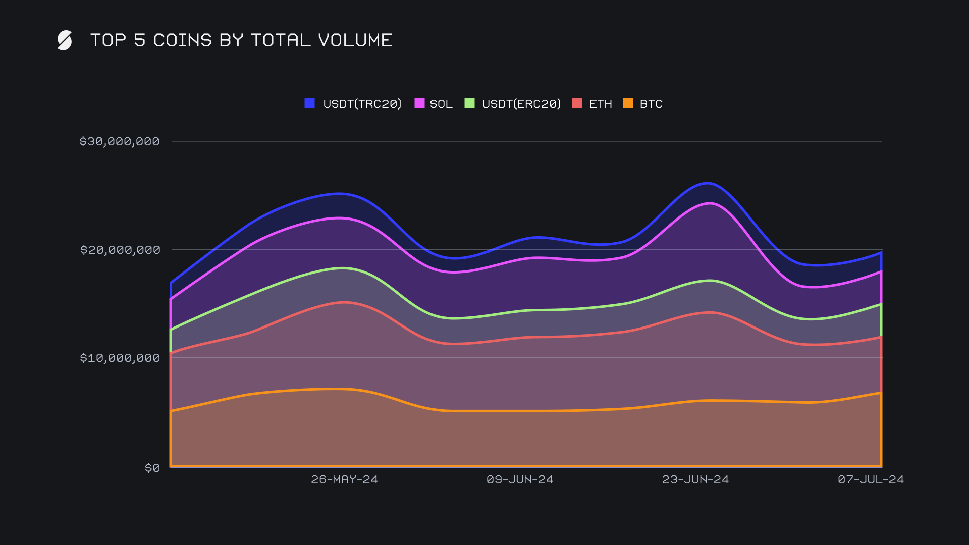 BTC surged to reclaim its position as the top coin with a total weekly volume of $6.6m, marking a robust increase of +21.1%. This jump in shift volume overtook ETH, which confidently sat on top for the previous six weeks. This resurgence was driven by a rise in both deposit volume, which ended with $2.5m (+11.2%), and settlement volume, which climbed to $2.1m (+8.5%). Both of these sums were enough to finish as the week’s most deposited and settled coin, outlining the idea that users tend to gravitate to BTC during times of uncertainty.