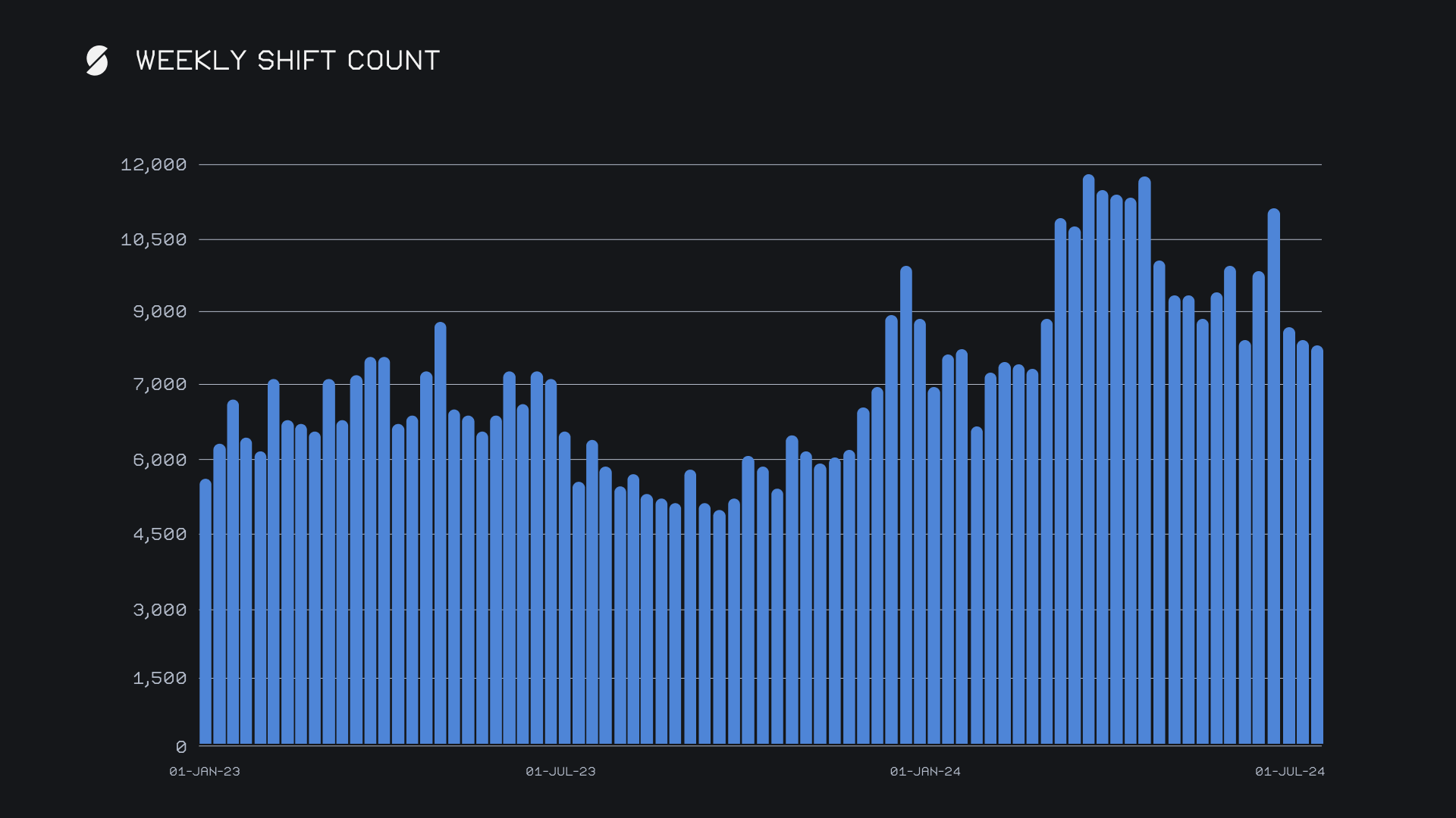 SideShift had a modest performance improvement compared to last week, ending with a gross volume of $13.8m (+6.5%). Our weekly shift count saw a slight decrease of -0.8% and totaled 8,301 shifts, which is a slower week when compared to other performances achieved earlier this year. However, as pointed out in last week’s report, this sum still sits higher than our running average, and is a significant step above those levels measured one year ago.
