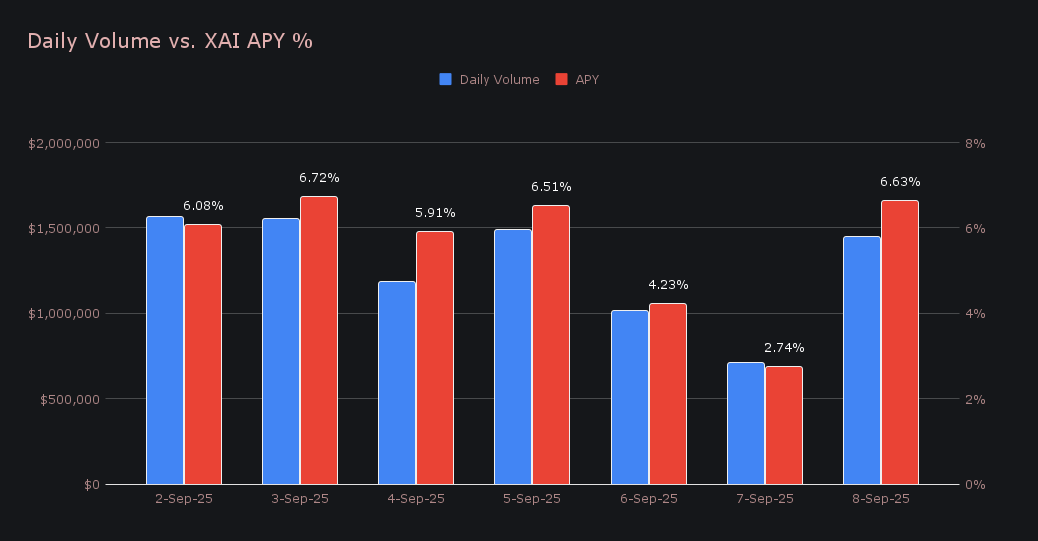 Staking rewards reflected the slower pace on SideShift, with 143,029.14 XAI ($24,232.16) being distributed to our staking vault at an average yield of 5.55% APY. The week’s standout came on September 3rd, when 24,685.29 XAI was paid out at 6.72% APY, backed by $1.55m in daily shift volume. Outside of that day, rewards and yields were dialed down, showing a clear link between lower site volume and reduced staking output as compared to recent weeks.