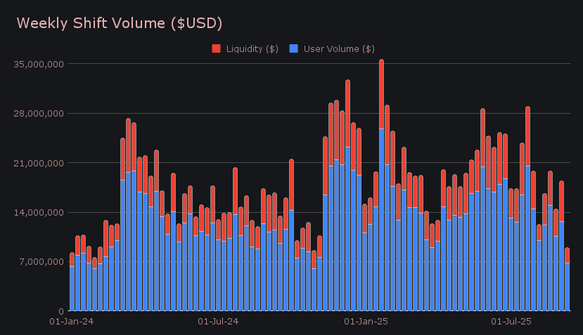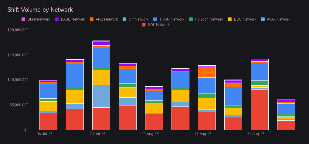 SideShift had a slow showing and logged $8.96m in gross weekly volume, down −51.3% from the prior period and thereby marking the lowest seven-day tally of 2025 so far. User shifting made up $6.82m (−46.2%), while liquidity shifting fell more sharply to $2.14m, with shift flows more evenly spread between deposits and settlements and thereby reducing the need for heavy internal rebalancing. The absence of large-scale shifts in more common pairs — such as BTC/USDT (ERC-20) — further weighed on totals, leaving this week’s leaders, TRX/BTC ($299.8k), ETH/USDT (ERC-20) ($283.4k), and BTC/USDC (ERC-20) ($267.7k), relatively small by comparison.