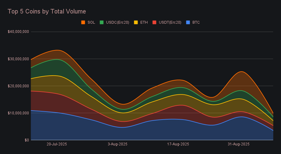 ETH and SOL both saw heavy reversals after ranking near the top in the prior report. ETH finished the period with a total volume of $1.80m, down from $4.63m (−61.0%). Deposits came in at $1.07m versus $1.76m last week (−39.2%), while settlements dropped more sharply to $548k from $1.58m (−65.2%). SOL was hit hardest, plunging to $1.32m from last week’s $7.05m (−81.3%). Settlements collapsed to $707k from $3.68m (−80.8%), while user deposits fell to $451k (−21.2%). The stark reversal underscored the absence of large settlement flows such as the BTC/SOL pair, which had driven last week’s surge to multi-month highs for the coin.