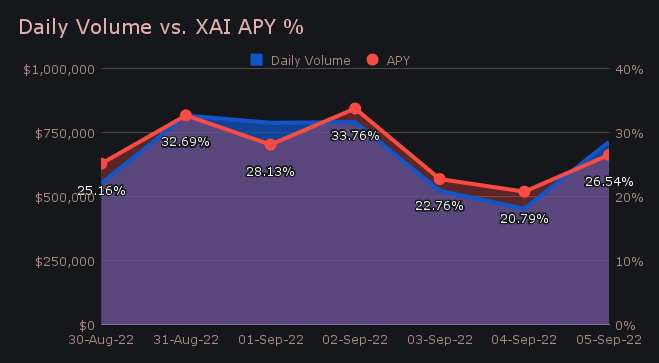 XAI stakers were rewarded with an average APY of 27.12% this week. On September 3rd, a weekly high of 29,496.91 XAI (33.76%) was paid to our staking vault, following a daily volume of $791k.