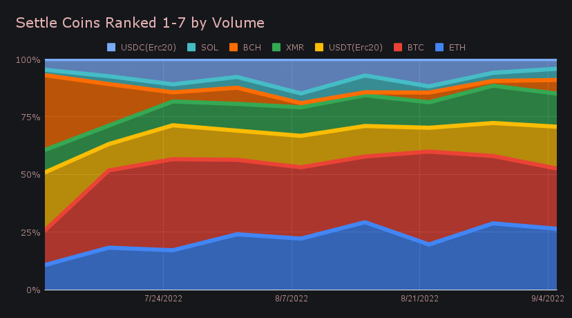 With the Ethereum merge being right around the corner, it appears that SideShift users are bullish on ETH. It finished as the week's most popular settle coin with a volume of $1.04m (-4.4% from last week), just barely outdoing BTC, which placed second with $1.03m (-6.8%). USDT on Ethereum finished as our third most settled coin with $716k, a solid 32.2% increase from last week.