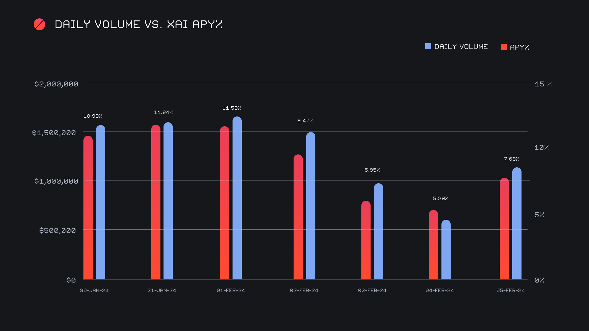XAI stakers were rewarded with an average APY of 8.96% throughout the week, with a daily rewards high of 35,485.38 XAI being distributed to our staking vault on February 1st, 2024. This was following a daily volume of $1.7m. This week XAI stakers received a total of 190,038.82 XAI, or $25,427.19 USD.