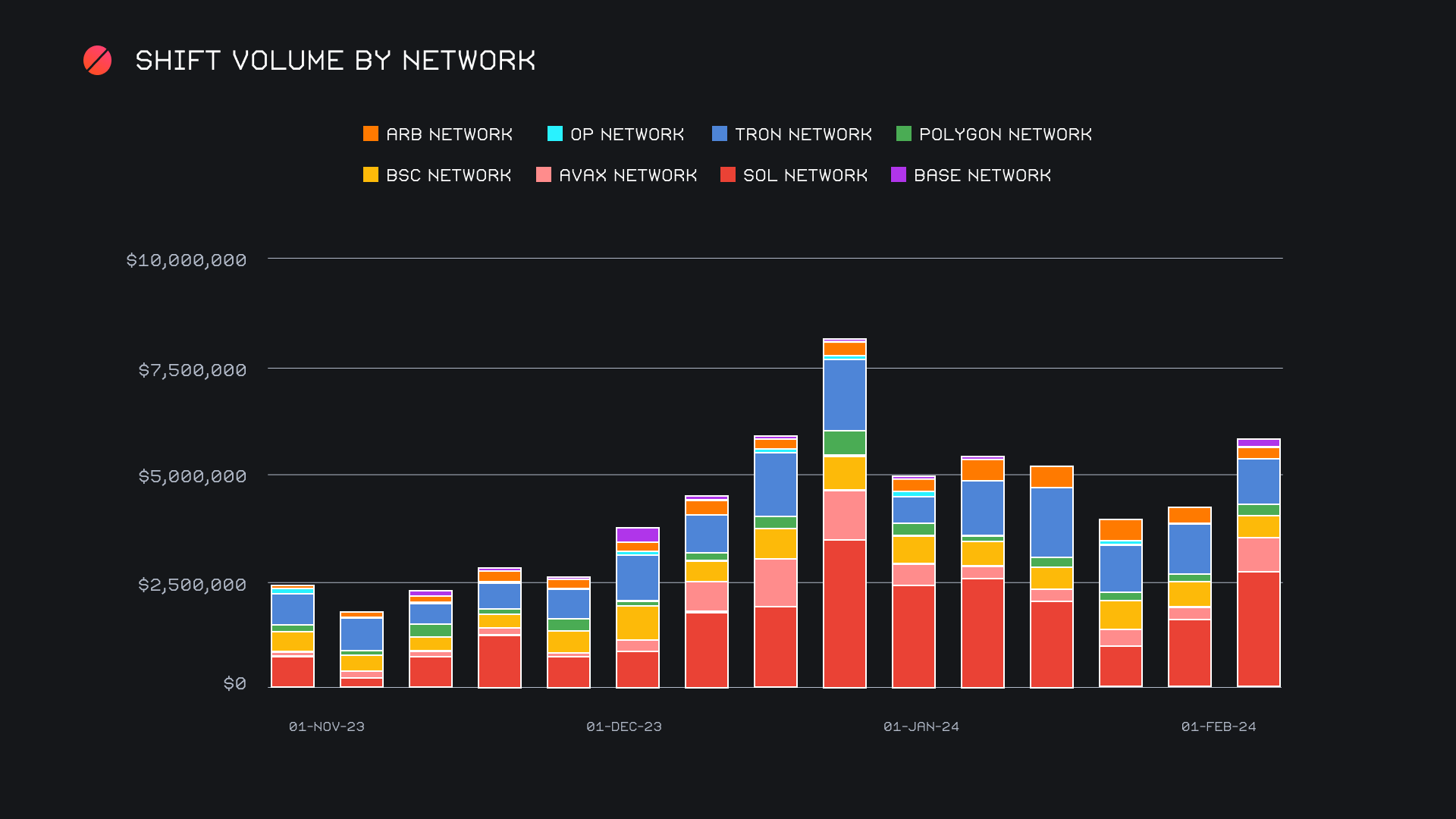 Not only did the native SOL token notice this uptick in shift action, but also USDC on Solana, which managed to nab 7th spot this week. A total volume of $536k represented a move of +149.2% on the week, marking the most significant change among all of our top coins. This contributed to the Solana network having one of its most impressive performances on SideShift to date. Its combined sum of $2.8m (+65.5%) led all alternate networks to ETH, nearly triple the volume of the runner-up, the Tron network. The Tron network still managed to surpass $1m, but just barely, with a final sum of $1.01m (-12.5%). Meanwhile, the Avalanche network charged its way into third place, after laying low for the better part of 5 weeks. Thanks to a quick surge in stablecoin shifting, the Avalanche network ended with a combined $745k (+160.6%). Even the Base network got in on the action, thanks to ETH (BASE) shifts incurring a spike which saw its network volume rip from just $13k last week, to $152k this week. All together, these alternate networks tallied $5.8m, now sitting only just behind the Ethereum network’s gross sum of $6.1m.