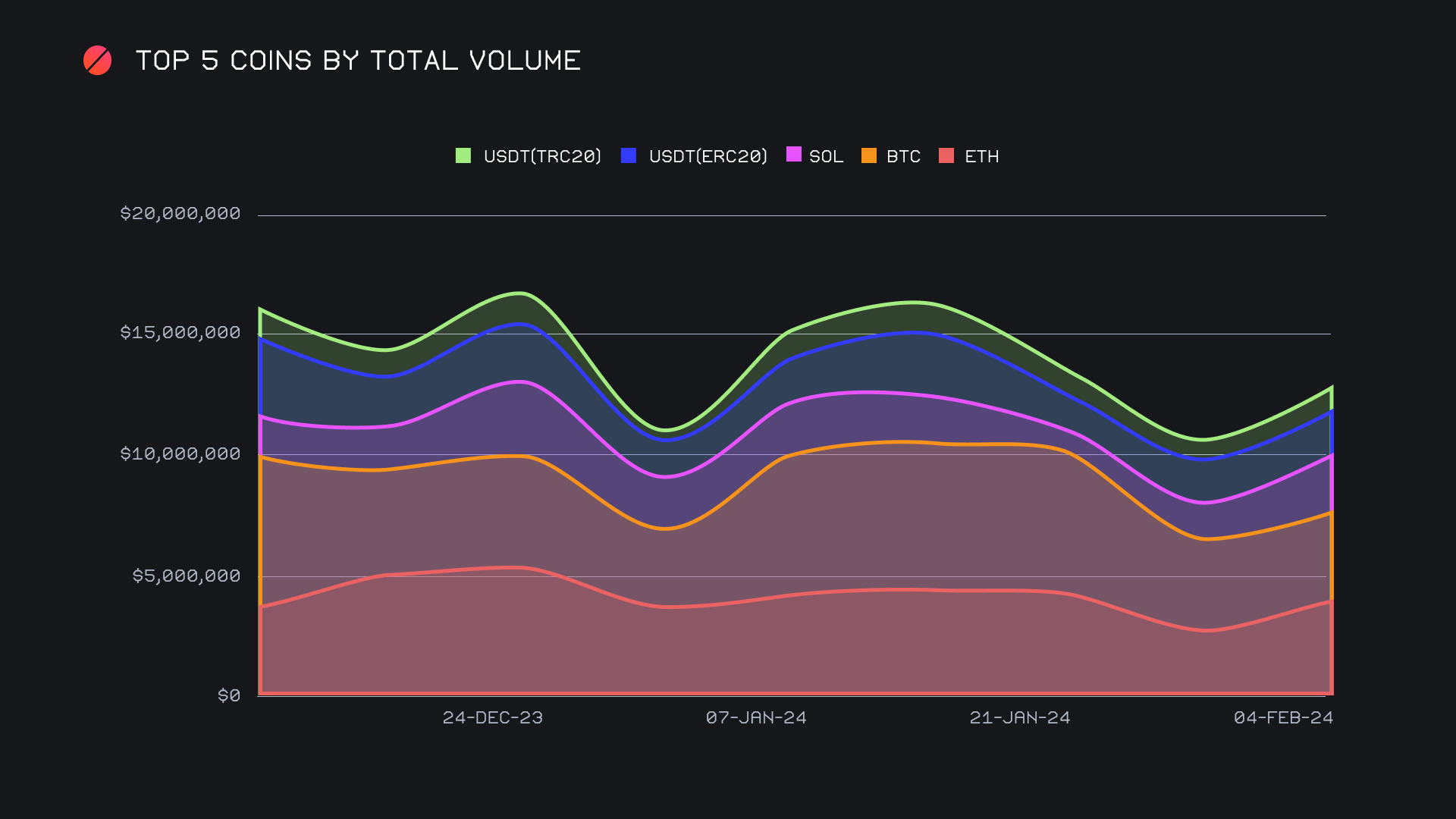 BTC still remained the preferred deposit method for users as it accounted for $1.8m in user deposits (+27.9%) and easily finished as our week’s most deposited coin. 37% of this deposit volume was shifted to ETH, as the BTC/ETH pair resumed its position as the most popular among users, this week doing so with $677k. However, despite the decent influx of BTC, an abrupt decline of -36% in user settlements produced a settlement sum of just $929k, thereby hurting BTC’s overall total volume. Instead of stacking BTC, it seems users had their eyes focused not only on ETH, but also coins such as USDT (ERC-20), and SOL.