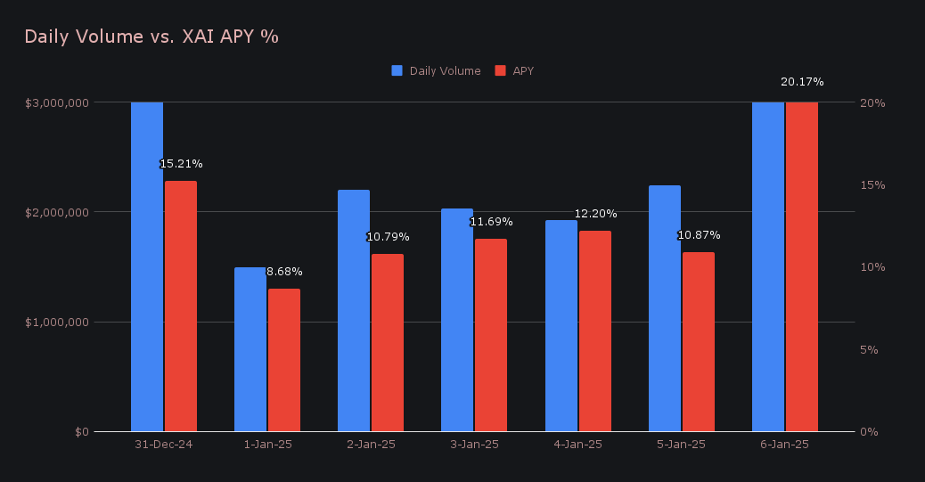 XAI stakers enjoyed an average APY of 12.80% over the week, with the highest daily rewards of 64,492.25 XAI corresponding to a peak APY of 20.17%, and being distributed to our staking vault on January 7th, 2025. Altogether, XAI stakers received a total of 294,554 XAI or $40,667 USD in staking rewards throughout the week.