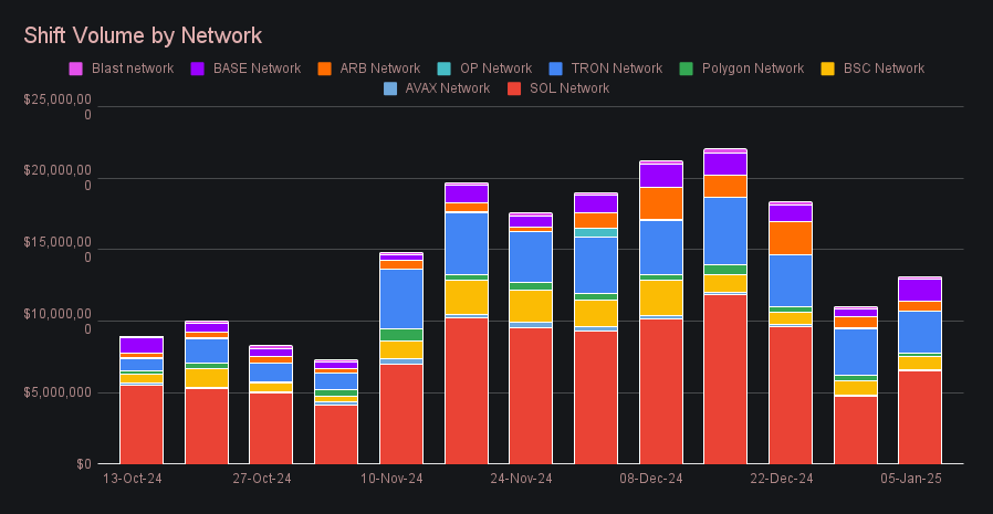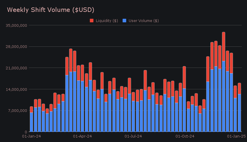 SideShift recorded a gross weekly volume of $16.0m (+6.1%), marking a steady start to 2025. Of this, $12.4m came from user shifting, with the remaining $3.6m stemming from liquidity shifting necessary for internal rebalancing. While this total represents a modest increase from the prior week, it remains approximately -30% lower than the average weekly volume achieved since the beginning of December 2024. Notably, December capped off an incredible run, with SideShift hitting $114.5m in total monthly volume, a new all-time high, following November's impressive $106m milestone. The holiday season did bring some slowdown, as is typical, but the platform still finished the year on an unprecedented streak of back-to-back record-breaking months.