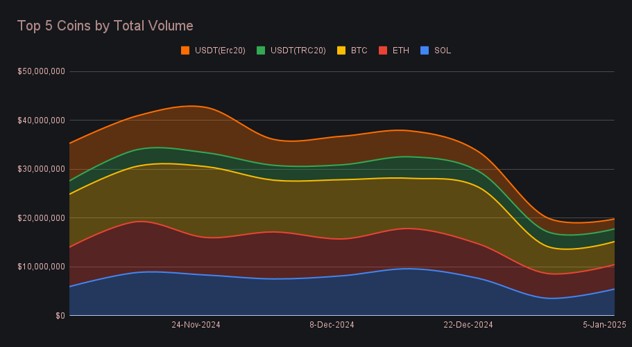 SOL returned to the top spot this week with a total volume of $5.5m (+52.1%), marking its first time as SideShift’s leader in several months. This performance was fueled by sizable increases in both user deposits, which climbed to $2.1m (+65.7%), and user settlements, which rose to $2.4m (+41.5%). Notably, SOL was the only coin among our top three to see its settlement volume increase, reflecting strong user demand for the token. These trends highlight SOL’s resurgence in popularity, supported by its recent price rally, and ongoing interest in both the AI and memecoin metas dominating on Solana.