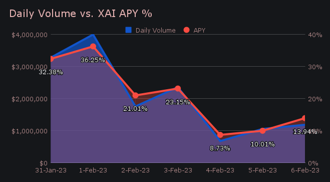 XAI stakers were rewarded with an average APY of 20.78% throughout the period, with a daily rewards high of 69,563.02 XAI (an APY of 36.25%) being deposited to our staking vault on February 2nd, 2023. This was following an extremely solid daily volume of $4.0m. As a whole, the 7 day rewards total which was paid to stakers amounted to $42,452.25 USD, or 292,209.89 XAI.