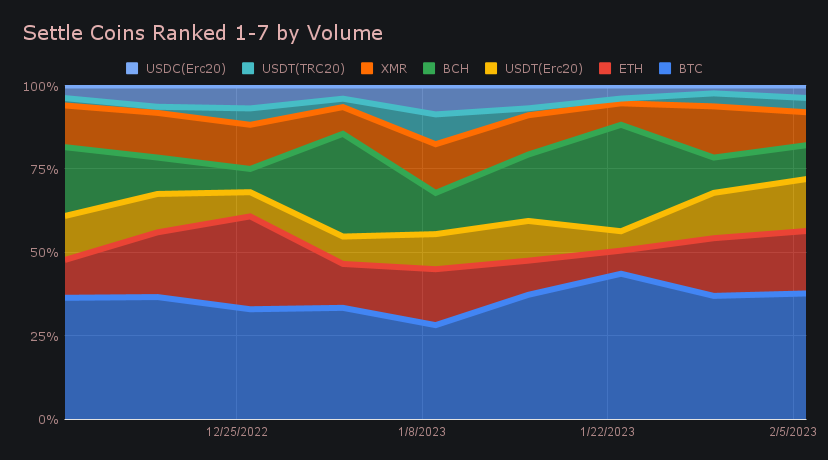 The changes on the settlement side were even more notable, with half our top 8 coins undergoing an increase of 100% or greater. The ranking pattern of the top 3 unfolded in the exact fashion as the deposits side - BTC was the most settled coin with $4.62m (+90.5%), while ETH placed second with $2.30m (+84.6%). In third was USDT (ERC-20), which boomed by 114.2% to total $1.91m and reclaim its spot among the top 3. Interestingly, this is the highest settlement volume achieved by USDT (ERC-20) since late November 2022, a time when most of the market was moving to stables, just after the FTX meltdown.