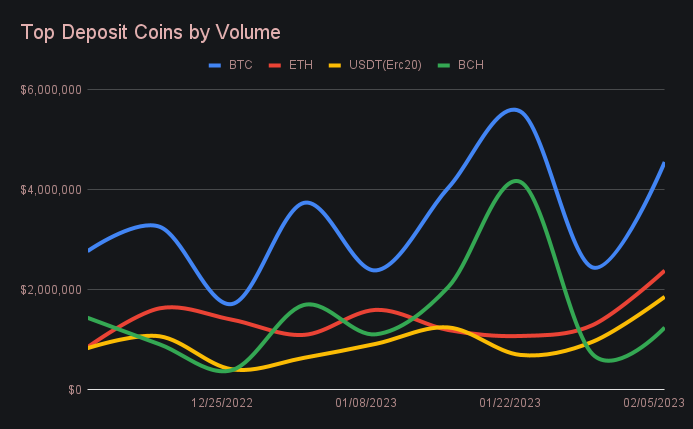 Liquidity rebalancing which was necessary to help fulfill the demand of popular shift pairs also played a part in volume changes among our most popular coins. Not only was this apparent in the cases of BTC and ETH deposit increases, but also BCH, which grew 75.3% to rank as the week’s 4th most deposited coin with $1.24m. Deposit volume among all 4 of our top coins rebounded sharply, as shown in the chart below.