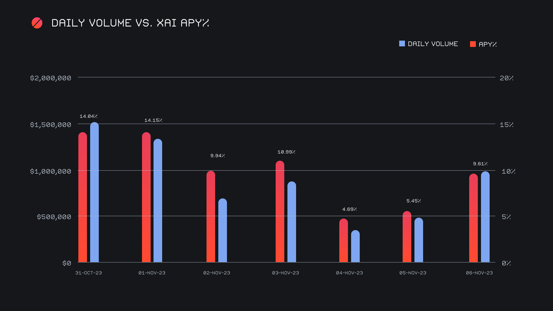 XAI stakers were rewarded with an average APY of 9.88% this week, with a daily rewards high of 40,835.34 XAI being distributed to our staking vault on November 2nd, 2023. This was following a daily volume of $1.3m. This week XAI stakers received a total of 201,714.28 XAI or 15,249.60 USD in staking rewards.