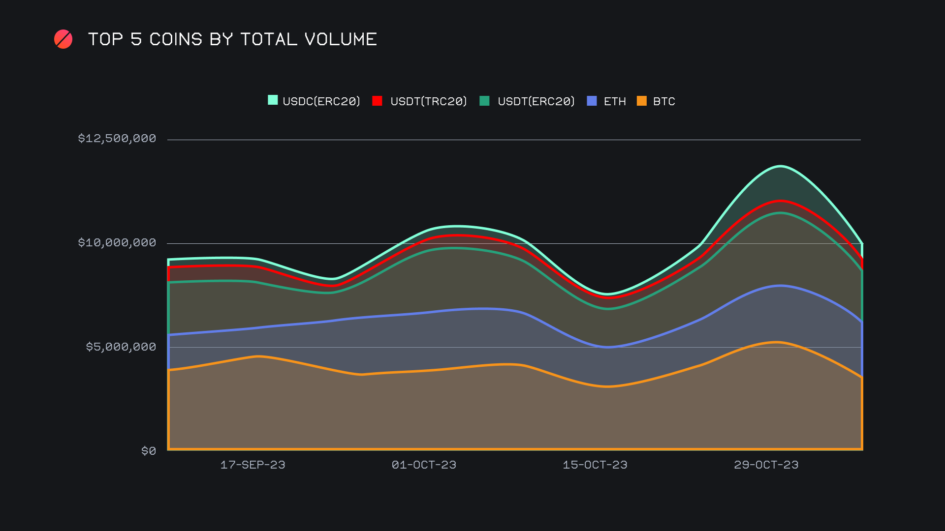 Both the spike in ETH demand as well as the ongoing (yet lesser) settlement volume of USDT (ERC-20) were key reasons for this high proportion for the ETH network. This is reflected by the fact that these coins composed the settlement portion of our top two most popular pairs. The BTC/ETH pair reigned supreme with $591k, marking the first time in 2023 that it has been the most popular among users. The jump even managed to surpass BTC/USDT (ERC-20), a pair which has remained a focal point throughout the entire year. Still, BTC/USDT (ERC-20) sat not too far behind in second place, with $562k.