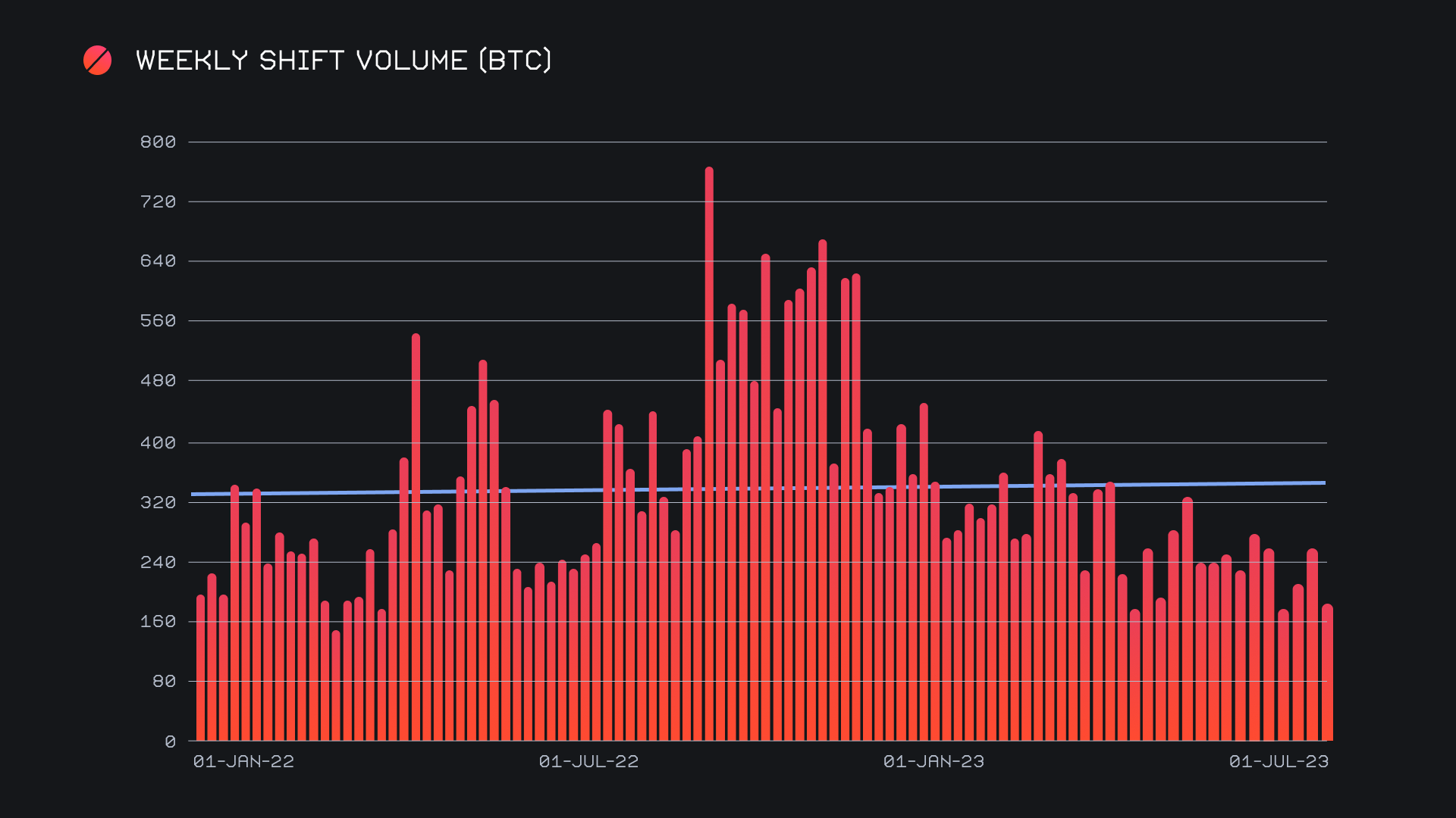 In the wake of a strong performance last week, SideShift ended the period with a gross $6.2m (-28.6%), a figure closer to its running 2 month average. This occurred alongside a shift count which was impacted to a lesser extent, falling -4.2% for a total of 5,889 shifts. It was mentioned in the previous report that the surge in volume was a result of an increase in shifts being carried out directly on the site. Similarly, this week’s decline can be attributed to the same factor. It should be noted that integration volume as a whole also declined, but to a lesser extent. Together, these figures combined to produce daily averages of $886k on 841 shifts. When denoted in BTC, our weekly volume amounted to 177.25 BTC (-30.2%).