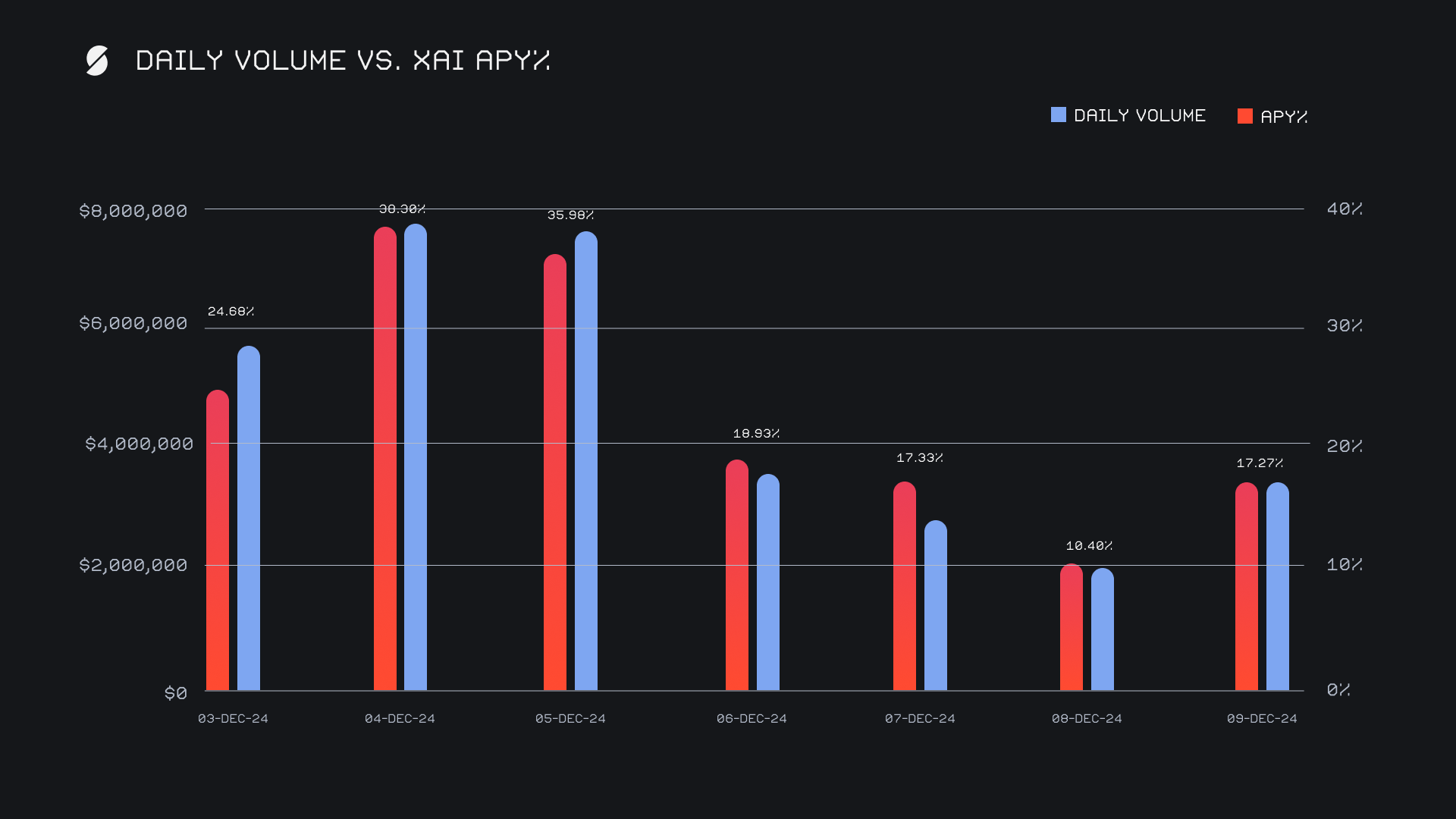 Staking activity on SideShift remained impressive, with a weekly APY average of 23.27% and a significant rewards high of 112,407.1 XAI being distributed directly to our staking vault on December 5th, 2024, corresponding to a peak APY of 38.30%. This spike coincided with yet another record-breaking daily volume of $7.7m, emphasizing the link between platform activity and staking returns. Altogether, XAI stakers received a total of 500,923.36 XAI or $78,895.43 USD in staking rewards over the course of the week.