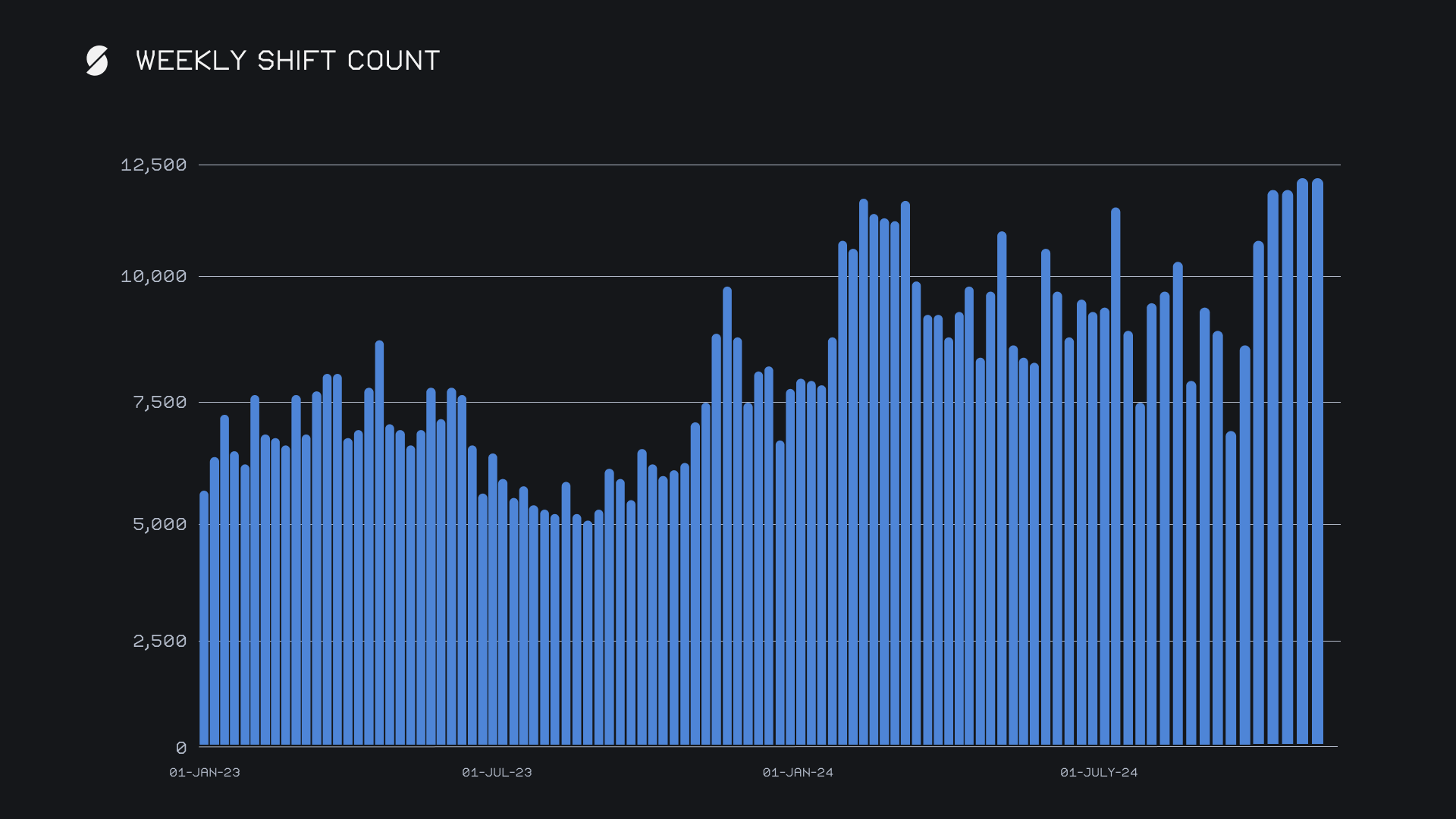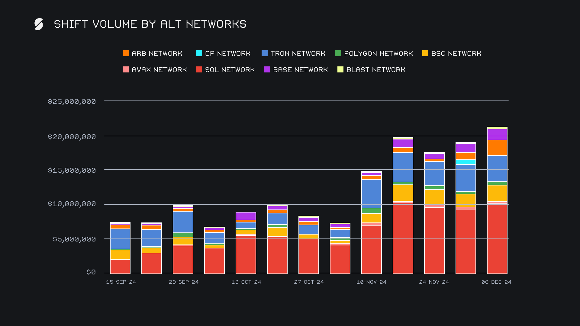 Our weekly shift count remained solid at 12,221 shifts (-0.4%), marking the fourth consecutive week above 12,000 and maintaining a sizable gap of +28% above the YTD average. Together with the record volume, this translated to robust daily averages of $4.67m across 1,746 shifts. BTC/USDT (ERC-20) reclaimed its position as the most popular pair among users, generating $1.7m, closely followed by ETH/BTC with $1.6m, reflecting consistent interest in these high-value pairs. Meanwhile, SOL shift pairs lagged behind the leaders, with activity spread more evenly across various coins, highlighting a more diversified but less concentrated demand for Solana-based shifts this week.
