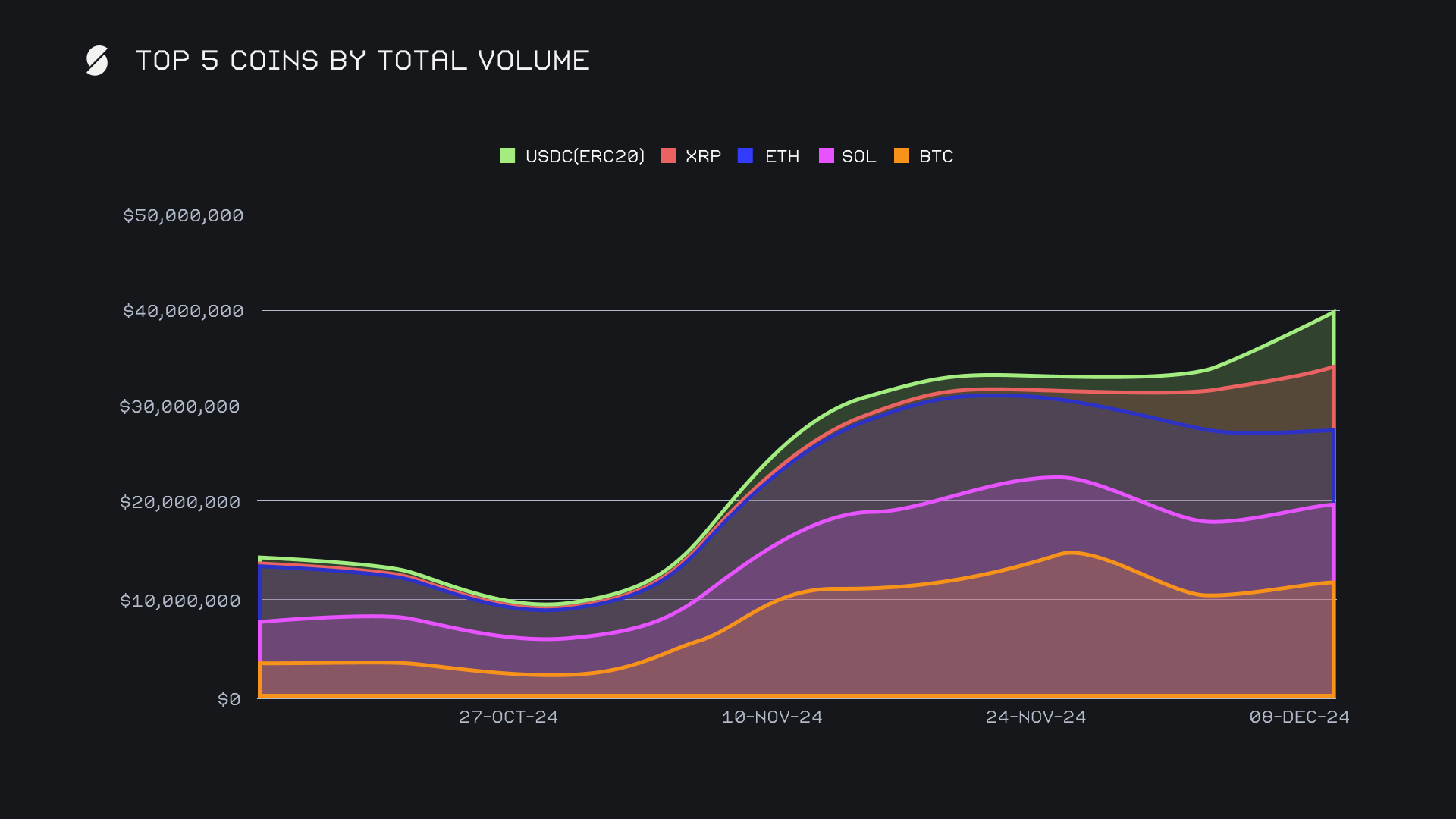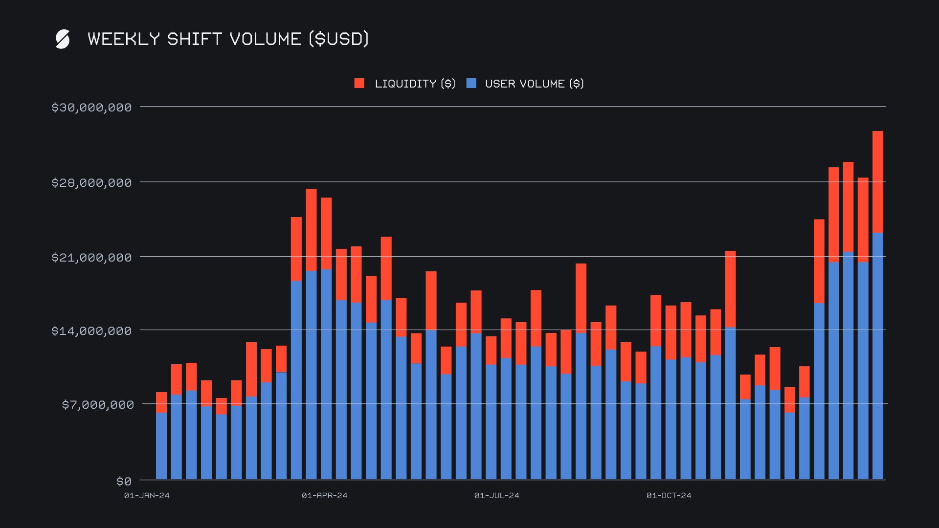 SideShift delivered another record-breaking performance this week, achieving an all-time high weekly volume of $32.7m (+15.4%), nearly double the YTD running average. User shifting contributed the lion’s share with $23.2m (+12.0%), while liquidity shifting climbed at a faster rate, adding $9.5m (+24.9%) to ensure the smooth execution of shifts. December 4th and 5th stood out as particularly exceptional, with volumes peaking at $7.7m and $7.6m, respectively, showcasing SideShift’s ability to seamlessly handle surges in activity.