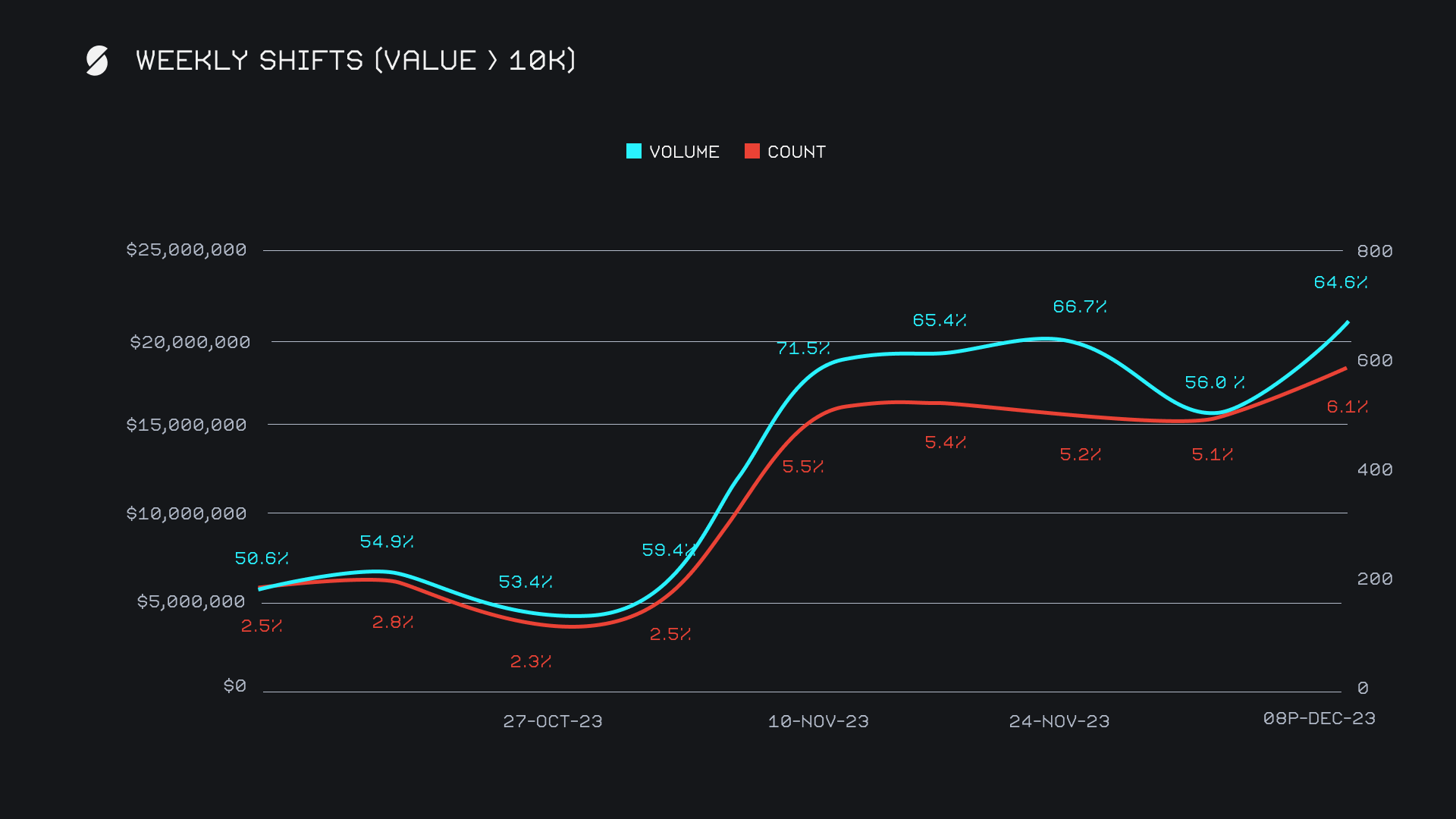Amid the overall rise in volume and count, this week set new records for whale shift activity on SideShift. A total of 741 large-scale shifts (those exceeding $10k) contributed $21.1m, marking nominal highs for both metrics. As highlighted by the percentages along the lines, whale shifts accounted for 64.4% of the week’s total volume and 6.1% of the total count. The sustained upwards trend in whale shift proportion activity over the past five weeks underscores its significant impact on SideShift's overall performance, driving a substantial portion of the platform's volume.