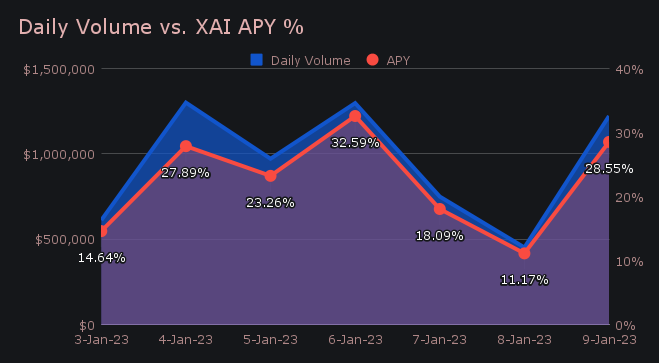 XAI stakers were rewarded an average APY of 22.31% this week. On January 7th, 2023, a daily rewards high of 54,422.46 XAI (yielding a 32.59% return) was deposited directly to our staking vault following a daily volume of $1.30m.