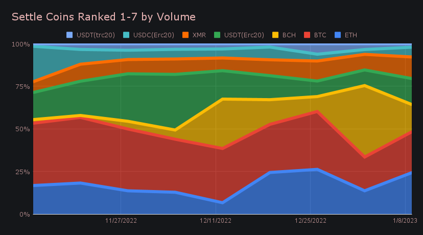 As mentioned in last week’s report, it appears that general stablecoin settlements on SideShift are steadily decreasing. Above you can see this gradual changing of the tide, as USDT settlements are becoming less popular, and slowly being overshadowed by popular coins such as BTC, ETH and BCH.