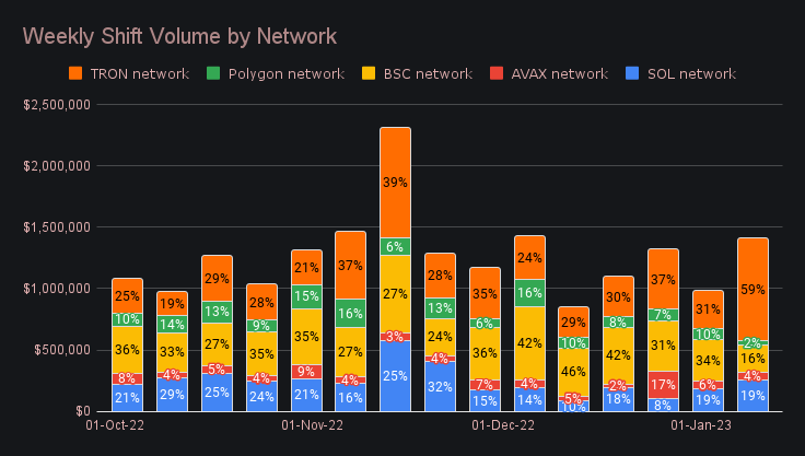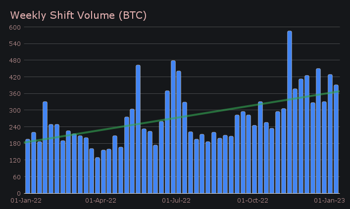 The first full week of 2023 was smooth sailing for SideShift, with the vast majority of coins and networks experiencing no interruptions. One of the few exceptions was the Liquid network, which was temporarily disabled to avoid a backup of shifts. The issue has since been resolved, and both deposits and settlements on Liquid have been re-enabled.