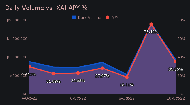 SideShift had a relatively strong week, with very solid performance throughout the weekend. XAI stakers were rewarded as a result, and received an average APY of 32.96% (+5.8% higher than our all time average). A weekly rewards high of 58,501.11 XAI was deposited to our staking vault on October 11th, which equated to an APY of 75.42%. This was following a daily volume of $1.90m.
