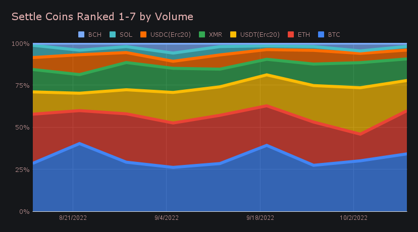 Stablecoins on the other hand were among the few coins which, on average saw decreases in shift action. As a whole stablecoins represented ~26% of settle volume, a 5.6% dip from last week. This ended the rising trend observed over the course of the past 2 months, whereby stablecoin settlements crept higher and higher.