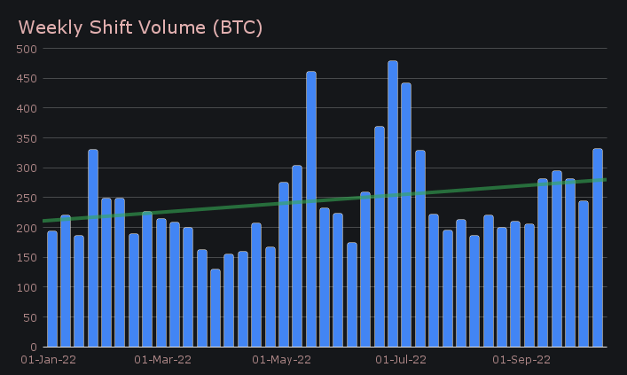 Not only was this the highest weekly volume observed since the beginning of July, but it also marked the highest weekly count seen since mid May (SideShift’s record setting week). This was very promising to see in spite of the general lack of excitement in the overall market. In the chart below you can see the weekly volume of SideShift denoted in BTC throughout 2022 thus far. This is a good metric to observe growth compared to the market overall, and although there may be fluctuations when measuring USD, the trend in BTC is firmly tilted upwards.