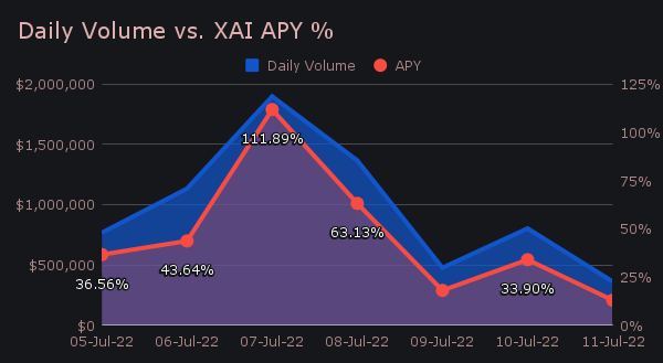 SideShift’s APY has continued to be very strong, averaging 45.71% for the week. On July 8th, a weekly high rewards sum of 67,514.04 XAI was distributed to stakers which amounted to 111.89%. This APY payout followed a volume day of $1.89m, and is now the 4th week in a row that SideShift has had a daily staking reward >100%.