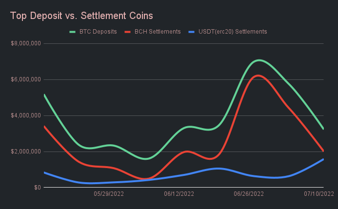After consecutive weeks of absolutely dominating the top of the deposit / settle volume lists, respective BTC and BCH numbers have now come back down to familiar territory. Still, BTC ranked first in deposits with BCH first in settlements, however the disparity between our top coins and others is now not as large. In recent weeks BTC deposits were as much as 12x higher than second place, with BCH settlements as much as 6x higher. This week BTC deposits netted $3.23m and were 3.94x higher than the runner up (LTC with $820k). Conversely, BCH settlements totalled $2.01m, while USDT (ERC-20) was not far behind with $1.59m.