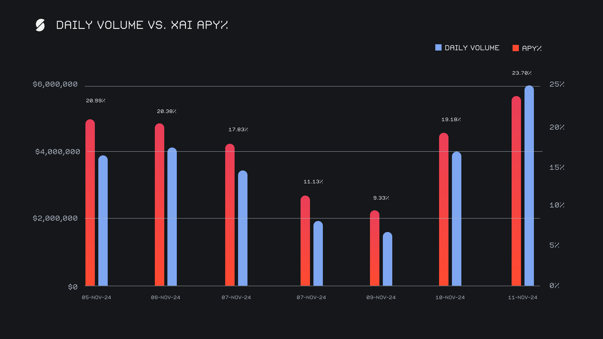 XAI stakers enjoyed a respectable average APY of 17.51% throughout the week. On November 12th, 2024, daily rewards peaked with 73,702.78 XAI being distributed directly to our staking vault, achieving an impressive APY of 23.7%, on a day that reached a record setting $6.1m in volume. The healthy APY’s, which were a result of steady shift action throughout the week, rewarded XAI stakers for their commitment, and reinforced the value of participating in XAI staking. Altogether, XAI stakers received a total of 388,594.91 XAI or $63,302.11 USD in staking rewards this week.