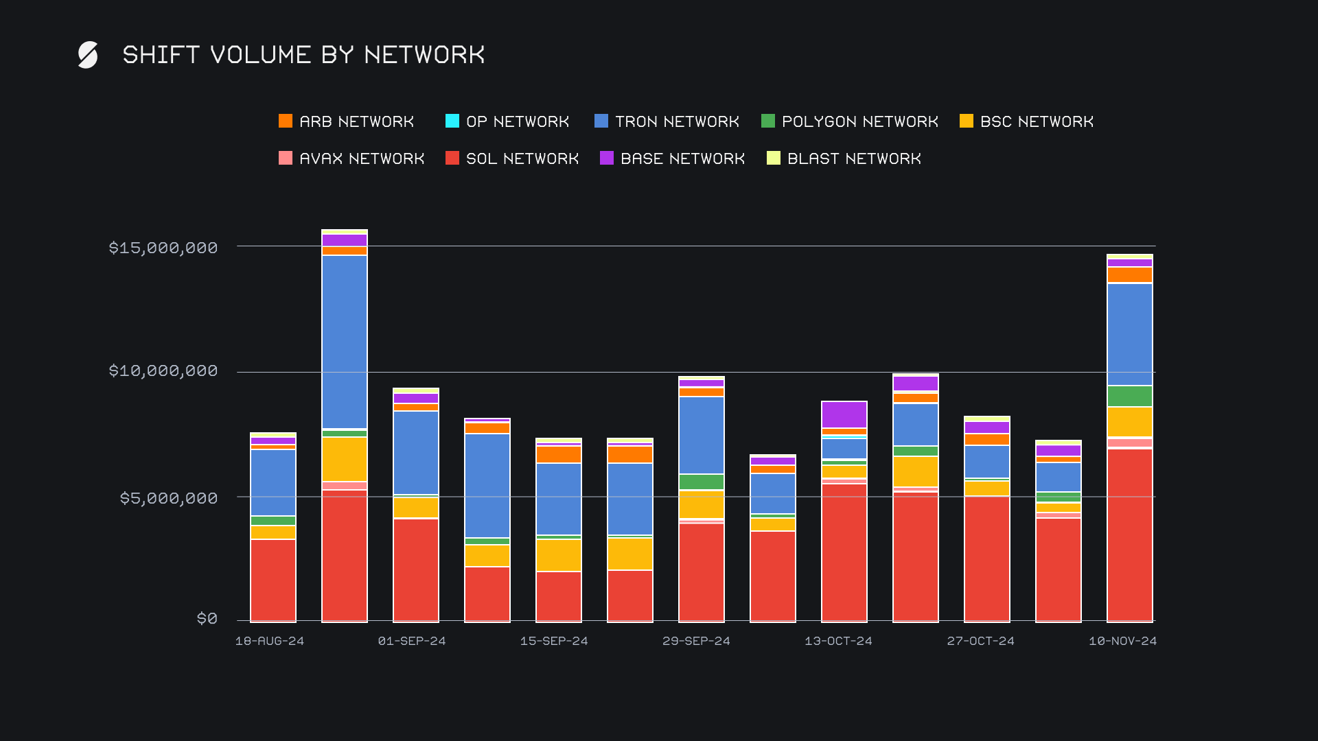 This week, alternate networks to ETH recorded a strong uptick of +103.4%, reaching a combined total volume of $14.7m (deposits + settlements). The Solana network led the charge with $7.0m (+67.5%), maintaining its position as the dominant network, driven by consistent interest in native SOL shifting. The Tron network saw a remarkable +247.7% increase to $4.1m, fueled by a revival in both TRX and USDT (TRC20) shifting. Similarly, the Binance Smart Chain (BSC) network climbed +193.4% to $1.3m, supported by rising shift action in both BNB and USDT (BSC). The Polygon network also stood out, doubling its volume to $827k (+100.1%). Notably, while most networks saw positive momentum, Base and BLAST were the only networks to experience declines, with Base down -10.5% and BLAST dropping -11.9%.