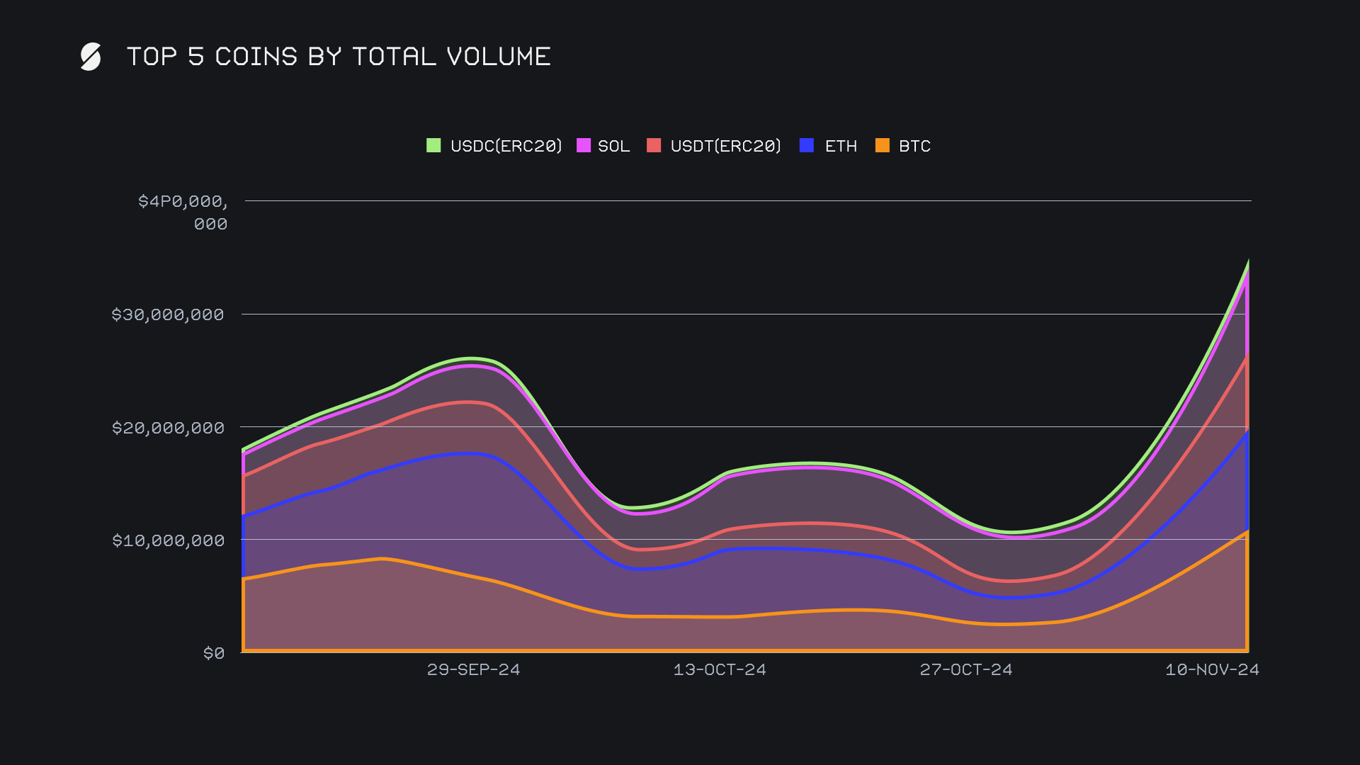 USDT (ERC20) leapt into third place with $7.7m, achieving an impressive +296.1% increase from the previous period, and thereby representing the highest gain among any of our top coins. This move was underpinned by a robust climb in user deposit volume, up +275.6% for $1.6m, and settlement volume, which rose +242.9% for $3.1m. Compared to last week, USDT’s resurgence as a preferred stablecoin emphasized its critical role during this period of heightened market activity, cementing its position as a cornerstone for user shifts.