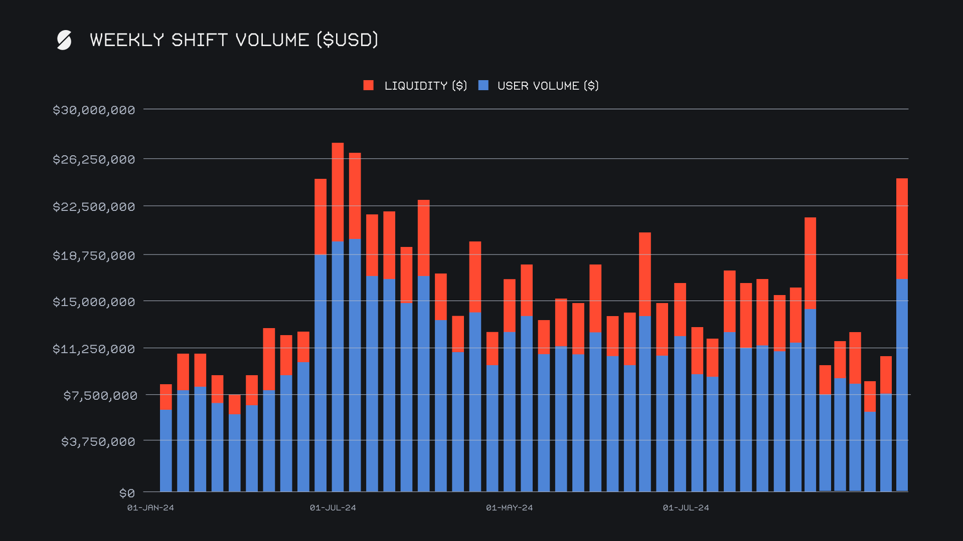 SideShift recorded a significant performance as well, achieving a gross weekly volume of $24.7m, a remarkable +132.4% increase from the previous week, and marking the third highest volume ever seen in the platform's history. User shifting volume contributed $16.5m (+116.2%), while liquidity shifting volume climbed to $8.2m, driven by heightened activity and shifts involving BTC. This impressive weekly total sat approximately ~60% above our YTD running average. Our daily averages ended strong, with volume hitting $3.52m across 1,556 shifts.
