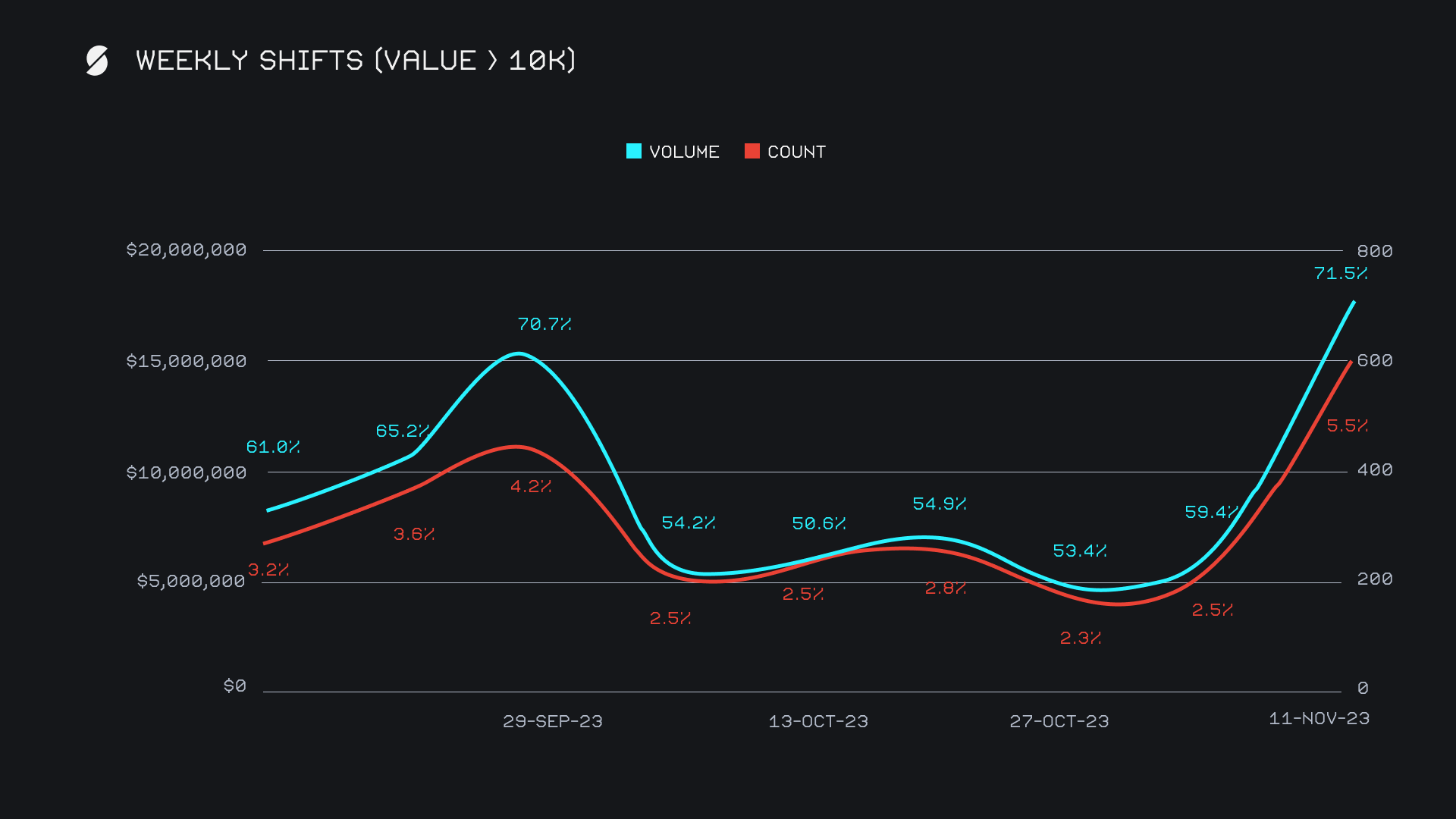 Shift action this week was not only driven by our top coins, but also by key contributions made from a variety of coins outside the top 5. Several saw their weekly volumes more than triple - examples include TRX exploding +712% for $1.4m, BCH increasing +283% for $676k, ADA rising +335% for $557k, and DOGE seeing the highest percentage gain of all, climbing +748% for $467k. This widespread increase in shift action was also complimented by a notable spike in whale shifting, as weekly shifts with a value exceeding $10k accounted for 71.5% of our volume, a multi month high. A weekly sum of $17.6m in whale shifting was a near tripling from last week’s total of $6.3m.
