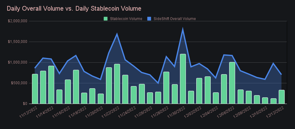 As the year is creeping to an end, SideShift’s focus has been on finalizing year end projects and tying off any loose ends. We continue to prioritize growth and improving the overall usability of the site. Ultimately, the week was solid with just a few minor interruptions. We disabled SLP and SRM as a result of low liquidity - these tokens remain disabled as a shift option for the time being. Next, we had some instability with the BSC and SOL networks due to our node providers, which may have resulted in a slight delay for a handful of users shifts. Both networks are now stable, and shifting has resumed as normal.