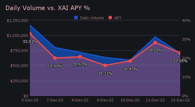 XAI stakers were rewarded with a healthy average APY of 22.72% throughout the period. On December 7th, 2022, a daily rewards high of 40,833.29 XAI (32.91%) was deposited to our staking vault, following a daily volume of $1.17m.