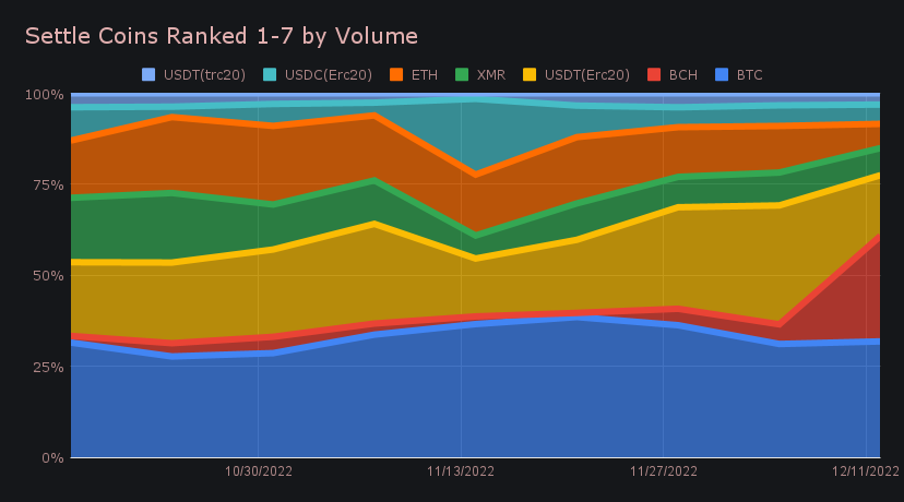 On the settlement side BTC reclaimed its title as the most demanded coin, with a total of $1.64m (-15.7%). BCH roared back to life to seize second place, reviving a trend which also hasn’t occurred since July 2022. It finished the period with $1.50m, a whopping 342.6% increase in settlement volume. For reference, this figure has typically sat around the $200k per week mark since the summer months. The spike is made evident in the chart below. In third place was USDT (ERC-20), which saw a significant decrease in demand, ending the period with $860k (-57.9%).