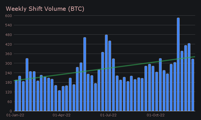 Integrations as a whole slowed significantly in the wake of a record settling week. They combined for $1.44m in volume, which represented 25.8% of the weekly total. As compared to last week’s proportion, this is a decrease of 22.6%. In fact, it is the lowest proportion observed since the end of June 2022. Decreases in shift activity were steady across the board, as it is likely most users are simply HODL’ing for the time being. Shift count among all integrations however did remain quite strong, as it summed to 36.4% for the week - a level fairly consistent with those noted over the course of the past month.