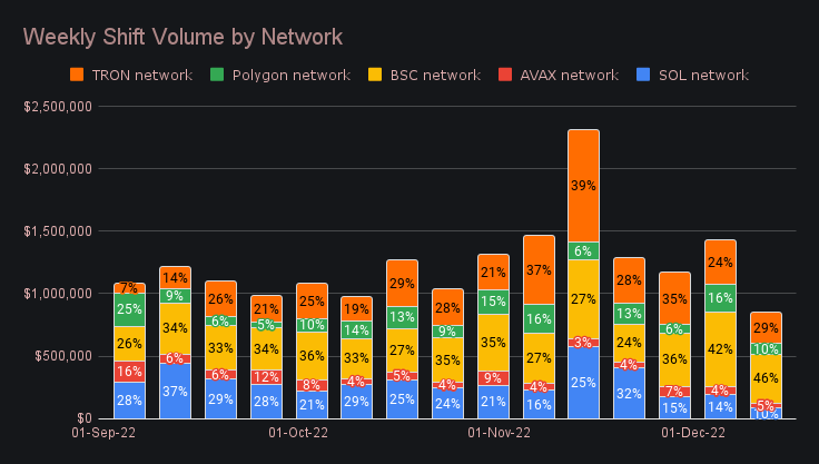 Shifting on networks other than ETH also decreased this week, dipping below a cumulative $1m for the first time in 2 months. These networks (Tron, Solana, Binance Smart Chain, Avalanche, and Polygon) combined for $852k in shift volume, with the BSC network once again accounting for the highest proportion. Among this volume on BSC, the majority of it came from users shifting out of BUSD to stablecoins on Ethereum (USDC and USDT), perhaps related to the ongoing Binance FUD. Approximately $254k of BUSD was shifted to other coins, with 85% of that being the aforementioned stablecoins on Ethereum.