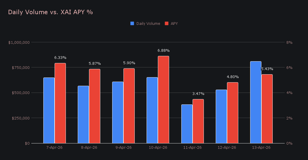 XAI stakers received 146,622.50 XAI ($12,545.55) this week at an average APY of 5.53%, with April 10th proving the most rewarding day at 25,942.74 XAI distributed and a 6.88% APY on the back of $649k in daily volume. XAI itself saw a brief moment of life mid-week, spiking around 6% from its weekly open before settling back to $0.0872, closing the week up +4.5% with the market cap ticking up to $13.94m (+6.99%).