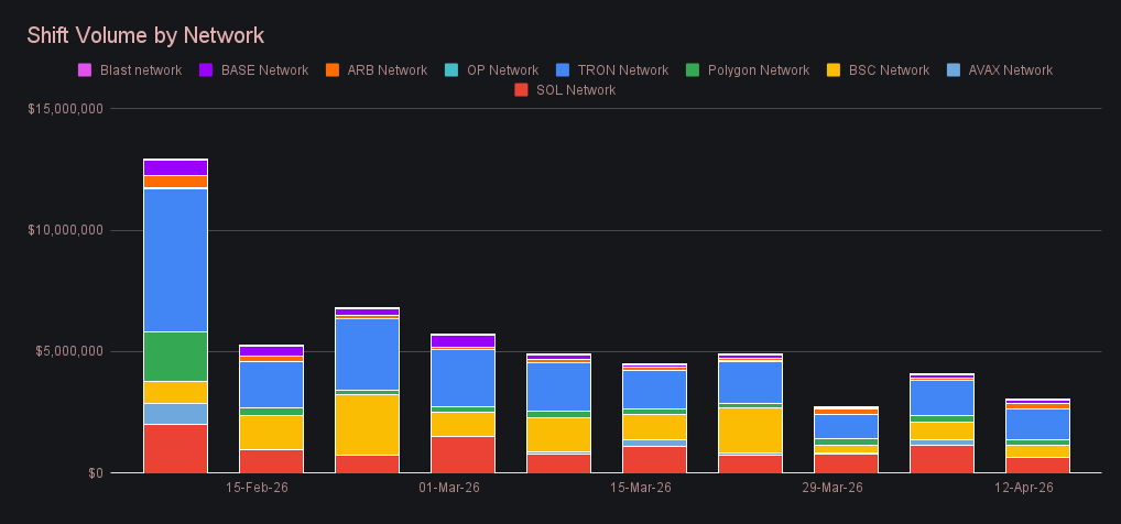 Alt networks combined for $3.01m (-25.8%), with the Ethereum network holding relatively steady at $2.13m (-5.5%). The Tron network held its ground at the top of the alt stack with $1.27m, though it's worth noting it has been on a long, gradual slide from the $5.9m it was putting up earlier in the year — a trend that continues to quietly define the platform's network mix. Solana had a tough showing, dropping to $661k and its lowest point in this window, while the BSC network followed a similar path to $490k, now a fraction of the gross $1.86m it generated late last month. Arbitrum was the week's most encouraging alt story, more than tripling to $225k, still modest in the grand scheme but a genuine step in the right direction after weeks of laying low. Polygon held consistent at $204k, the Base network was virtually flat at $126k, and Avalanche dropped sharply to $29k after last week's $255k, with the native shifting activity that had briefly inflated its numbers nowhere to be seen this time around.