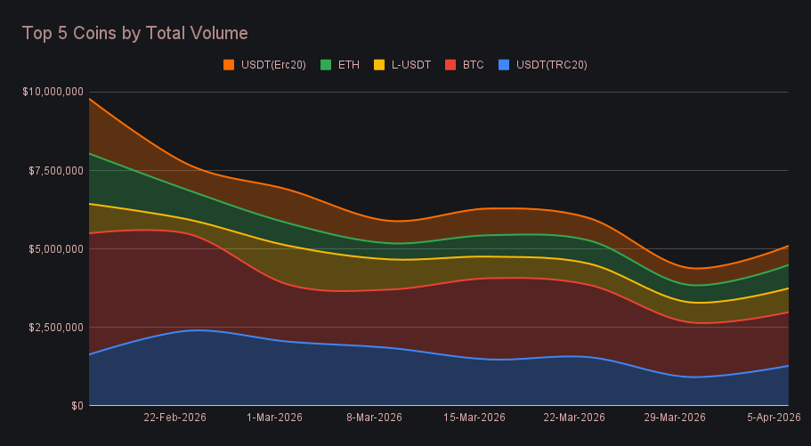 ETH was the week's standout, rising to fourth at $883k (+18.7%) against the broader tide. User settlements reached $468k against deposits of $246k — users were buying, and with more conviction than last week when the two figures sat almost side by side. It's the coin's strongest performance since mid-February and one of the few genuinely positive signals in this week's data. USDT(ERC20) rounded out the five at $418k (-31.7%), with users rotating away from it after a recent stretch of heavier stable activity. Outside the top five, USDT(BSC) continued its collapse to $327k, difficult to ignore given it was commanding $1.49m as recently as three weeks ago, while L-BTC quietly climbed to $359k, its best showing in several weeks.