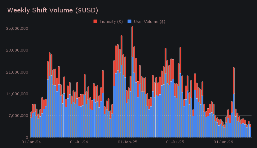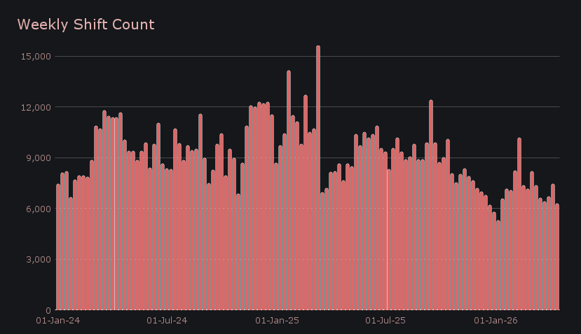 Shift count came in at 6,291 (-15.7%) for a daily average of 899. Last week's recovery in lower mid-sized shifts proved to be a one-week blip rather than any kind of turning point, with that cohort nearly halving back toward where it sat before the bounce. Sub-$100 shifts also pulled back to 3,803, their lowest count in the past few months, though at that size the contribution to overall volume is limited. The over $10k count held relatively flat at 80 shifts, consistent with the modest whale volume uptick — those participants were present, just not in numbers sufficient to offset the lulls noted elsewhere.